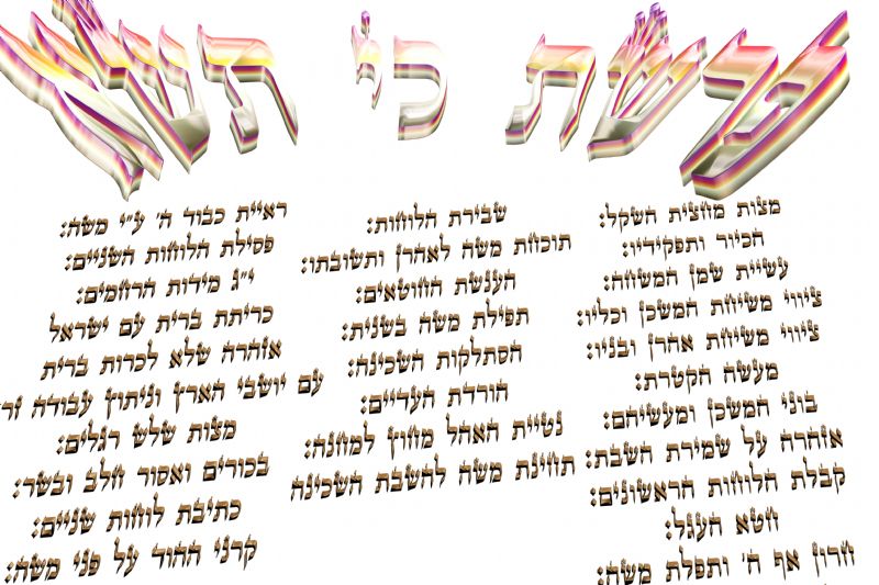 גָּרַם לְאוֹתוֹ עֵץ שֶׁשּׁוֹרֶה בּוֹ הַמָּוֶת לְכָל הָעוֹלָם, וְגָרַם פְּגָם לְהַפְרִיד אִשָּׁה מִבַּעְלָהּ, וְעָמַד הַחֵטְא שֶׁל הַפְּגָם הַזֶּה בַּלְּבָנָה עַד שֶׁעָמְדוּ יִשְׂרָאֵל בְּהַר סִינַי. כֵּיוָן שֶׁעָמְדוּ יִשְׂרָאֵל בְּהַר סִינַי, הָעֳבַר אוֹתוֹ הַפְּגָם שֶׁל הַלְּבָנָה וְעָמַד לְהָאִיר תָּמִיד הפרוד של זכר ונקבה המשיך עד מעמד הר סיני שם נגמר הפגם הוסרה הקללה לכו לאהליכם משמע התחברו זכר ונקבה והיו שוב לאדם אחד ושוב בא המפריד בתחפושת חדשה לא נחש דמוי אדם ערב רב והפעם הזכר שבאדם פותה הודח כֵּיוָן שֶׁחָטְאוּ יִשְׂרָאֵל בָּעֵגֶל, שָׁבָה הַלְּבָנָה כְּמִקֹּדֶם לִפְגָמָהּ, וְשָׁלַט הַנָּחָשׁ הָרָע, וְאָחַז בָּהּ וּמָשַׁךְ אוֹתָהּ אֵלָיו וְנִפְגְּמָה. ושוב הורידו את התורה שבעל פה - השכינה - הנקבה הלבנה לתוך תהומא רבא לתוך פי הנחש משה רבינו נקרא תורה שבכתב הוא בעלה של התורה שבעל פה מעמד הר סיני היה אמור להיות חתונתם לעדי עד חיבור אל עץ החיים הוריד את תורת עץ החיים הם הלוחות הראשונים וּכְשֶׁיָּדַע מֹשֶׁה שֶׁחָטְאוּ יִשְׂרָאֵל וְהָעָבְרוּ מֵהֶם אוֹתָם כְּלֵי זַיִן הַקְּדוֹשִׁים, יָדַע וַדַּאי שֶׁהֲרֵי הַנָּחָשׁ אָחַז בַּלְּבָנָה לִמְשֹׁךְ אוֹתָהּ אֵלָיו וְנִפְגְּמָה. אָז הוֹצִיא אוֹתָהּ בַּחוּץ. שבר את הלוחות ופרחו האותיות לאן פרחו? כל נשמות ישראל הקדושים שהיו ושיהיו היו שם כל נשמה חטפה קפצה על התורה של עץ החיים ולקחה אותה אל תוכה וכשבאה הנשמה הזו לעולם הוציאה מהכח את האותיות שלקחה הם הצדיקים החכמים הסופרים של עם ישראל רבי יהודה הנשיא נשמתו לקחה את המשנה וכשבא לעולם כתב את המשניות שקיבלה נשמתו בשבירת הלוחות רבי שמעון בר יוחאי לקח את הזוהר והוציא אותו אל הפועל וכן כל חכמי ישראל ולכן התורה שבעל פה ההלכות המדרשים המשנה הגמרא ספרי המוסר הם כולם ניתנו לנשמות ישראל במעמד הר סינ סיני וכל אלו הספרים הם תורתו של הקב"ה הלוחות שנשברו. וזה "כי תשא", לכל נשמה יש בכוח מה שלקחה במעמד הר סיני.