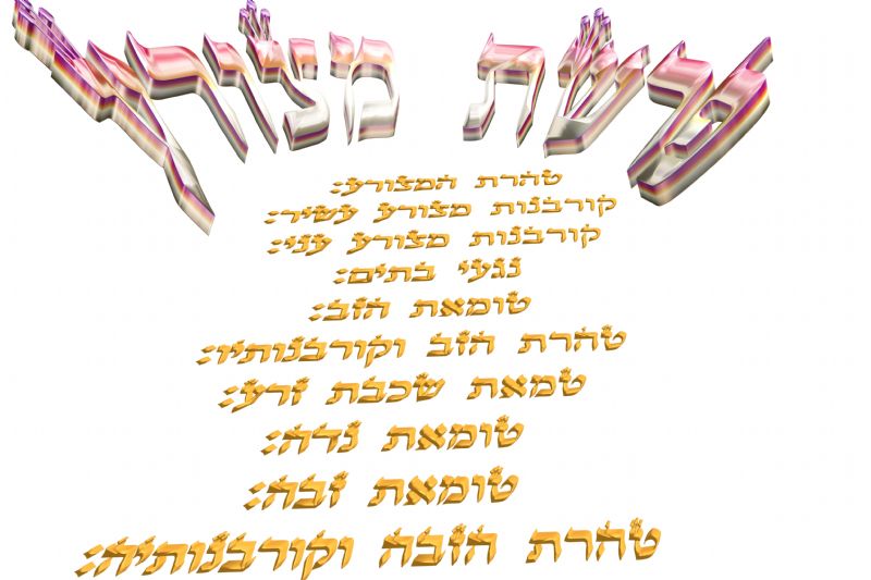 תזריע מוצש פרשת תזריע ענינה הוא טהרת האדם ולבושיו כל המחלות הן תוצאה של העדר אור בלבוש הרוחני בזמן בית המקדש - המחלה היתה מדברת עם הכהן וידע בדיוק את מקורה איזה עבירה נעשתה שהחסירה את האור מהאבר הרוחני וגרמה מחלה לאבר הגשמי התורה מונה את סוגי הסימנים וגם בליבושי האדם - הבגדים היו סימני מחלה - העדר אור בפרשת מצורע ידבר על ליבושים יותר רחוקים כמו - בית כפר וכו" כעת נעסוק בזוהר של תחילת הפרשה (ויקרא יב) וַיְדַבֵּר יְיָ" אֶל מֹשֶׁה לֵאמֹר אִשָּׁה כִּי תַזְרִיעַ וְיָלְדָה זָכָר וְגוֹ". רִבִּי אֶלְעָזָר פָּתַח, (שיר השירים ג) עַל מִשְׁכָּבִי בַּלֵּילוֹת בִּקַּשְׁתִּי וְגוֹ". עַל מִשְׁכָּבִי, בְּמִשְׁכָּבִי מִבָּעֵי לֵיהּ, מַהוּ עַל מִשְׁכָּבִי. אֶלָּא כְּנֶסֶת יִשְׂרָאֵל אָמְרָה קָמֵי קוּדְשָׁא בְּרִיךְ הוּא, רבי אלעזר פותח את פרשת תזריע בפסוק משיר השירים על משכבי בלילות למה אומר על משכבי למה לא אומר במשכבי ------ משכבי הוא המשכב של ביתי בית המקדש על בית המקדש היא מקוננת על המשכב ההוא היא בגלות מי זאת היא? משכבי שמי כב משכבי - אותיות שמי כב כב אותיות התורה זה שמה של השכינה הקדושה היא 22 אותיות התורה שבל פה הקב"ה ברא את כל העולם ב 22 אותיות אישה כי תזריע וילדה בן זכר אישה - היא האימא העליונה בינה שממנה יצאו בן ובת תורה שבכתב ותורה שבעל פה 22 אותיות שמהם כל הנבראים הם טיפת הזרע והכל יצא מהנקודה הסתומה שהכילה בתוכה את כל 22 אותיות שלכל אות משמעות וקשר לשאר האותיות כמו גוף עם הרבה איברים שמתפקד רק כאשר כל האיברים יחד קשורים ומשפיעים אחד לשני כמו הדרש הזה א - אלופו של עולם שממנו יצא הכל אל ה ב שהיא הבינה האימא העליונה על ידי ג " גומלת חסדים חמישה חסדים לדלת -ד - דלה ועניה השכינה המסכנה בגלות ורק על ידי גמילות החסדים היא מקבלת מעט שפע עבור בנה הוא אות י שבתוך אות ד ואז ד הופכת להיות ה וכאשר הבן גדל הוא הופך להיות עם 6 קצוות וו אות ו שהוא הבן שכל תכליתו היא אחותי רעייתי המלכות שהיא השביעית אות ז היא האות השביעית וכאשר אין שפע ויש רשע על ידי אלו שחוטאים באות ח שסוגרים את הגגל העליון כי ח סגורה מלעלה ואין שפע ואז בא הצדיק אין צדיק אלא טוב אות ט שפותח את הגג העליון וסוגר את הגג התחתון שהשפע לא ילך למטה זה ספר של יוחנן מעכשיו השפע הוא אות י שהתקבל על ידי שנסגר העולם התחתון השפל ונפתחו רקיעי שמים וירקד השפע וירד י מהיכן הוא הוא יורד מכסא הכבוד היא אות כ על ידי גילוי מלכותו של הקב"ה כ ל מ הוא מלך כאשר הצדיק ממליך את הקב"ה ועל ידי המלכתו נמשך השפע משער הנון שהיא הבינה 50 שערי בינה והשפע סגור ס אין כניסה רק למי שפועל במצוות התורה יקבל שפע ומי הם שומרי עין - שמירת עיניים פה - שמירת הלשון צ - שמירת הברית ק - מאה ברכות מובטח לו שתמתח רשת ר ש ת הגנה והוא תמיד יהיה שמור על ידי כ"ב אותיות ועל כך מקוננת השכינה על משכבי שמי כב בלילות מה הקשר ללילות לילה הוא חושך הגלות היא נמצא בלילות בגלויות הארוכה מכולם זו האחרונה ומה הגלות חושך? למה? כיון וְעַל דְּהִיא שְׁכִיבַת בְּאַרְעָא אָחֳרָא מִסְאֲבָא, אָמְרָה, עַל מִשְׁכָּבִי בָּעֵינָא, דְּכָאִיבְנָא (נ""א דשכיבנא) בְּגָלוּתָא, וְעַל דָּא, בִּקַּשְׁתִּי אֵת שֶׁאָהֲבָה נַפְשִׁי וּלְאַפָּקָא לִי מִנֵּיהּ. שארץ העמים מטמאה אויר העמים מטמא עפר העמים מטמא היא שוכבת בעפר הטמא הטומאה כואבת לקדושה ועל כך מבקשת את - אותיות - מא" עד ת" שאהבה נפשי כי הם רשת ההגנה שלה אותיות הקודש אינן פועלות בחוץ לארץ הן נשארו בישראל רק בישראל יש כוח לאותיות הקודש בחוץ לארץ הן שפות אחרות לכן אסרו במקומות מסויימים לדבר בלשון הקודש כי זהו חילול הקודש בִּקַּשְׁתִּיו וְלֹא מְצָאתִיו, דְּלָאו אָרְחֵיהּ לְאִזְדַּוְּוגָא (דף מב ע""ב) בִּי אֶלָּא בְּהֵיכָלֵיהּ, קְרָאתִיו וְלֹא עָנָנִי. דְּהָא בֵּינִי עַמִּין אָחֳרָנִין יָתִיבְנָא, וְקָלֵיהּ לָא שַׁמְעִין אֶלָּא בְּנוֹי. דִּכְתִּיב, (דברים ד) הֲשָׁמַע עָם קוֹל אֱלֹ